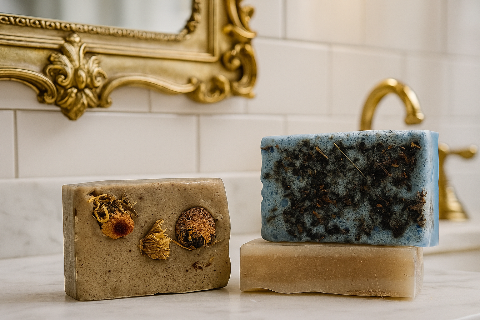 Conjunto especial com 3 sabonetes únicos: Calêndula suavizante, Sândalo aromático e Lavanda esfoliante. Cada um com argilas específicas para atender diferentes necessidades da pele em uma experiência variada e completa.