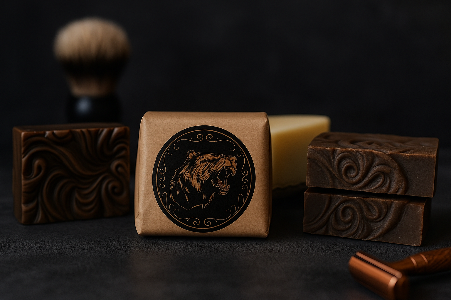 Sabonete masculino "Lenhador do Norte" com base de argila marrom purificante e essência robusta de sândalo e couro. Desenvolvido para o homem moderno que busca uma limpeza profunda com um aroma marcante e sofisticado.