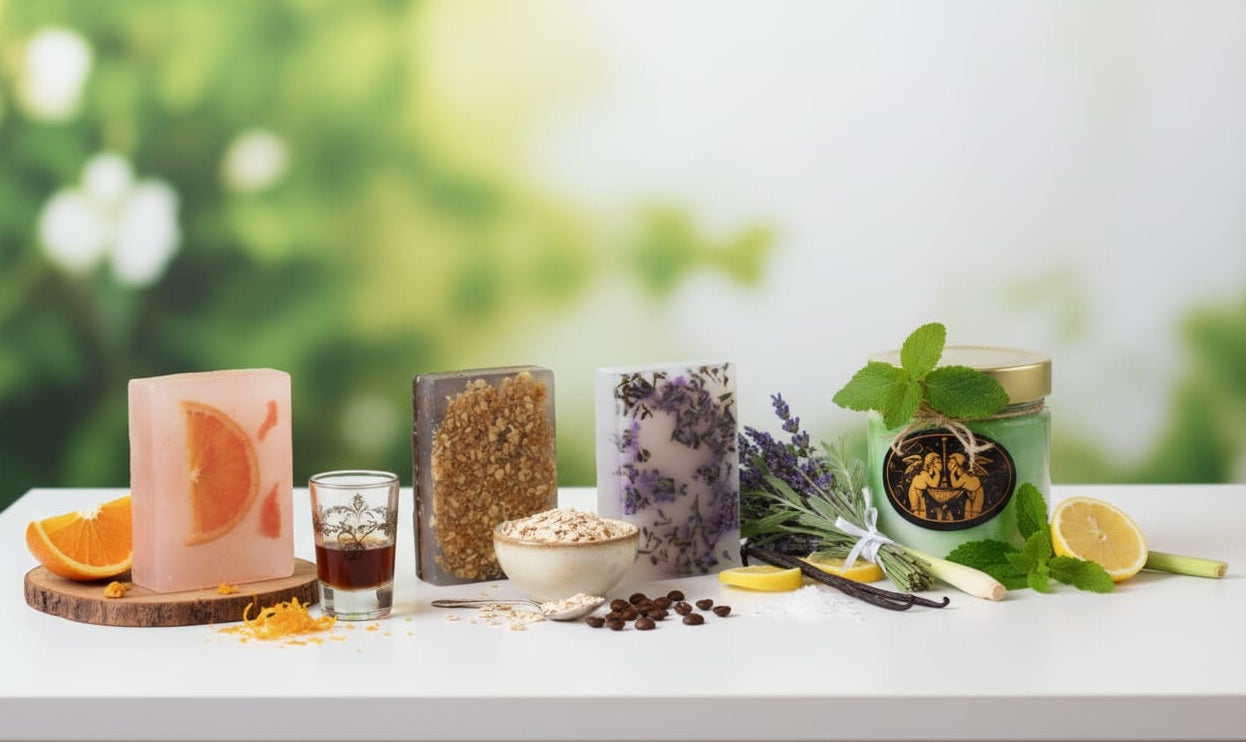 enquanto os pedaços naturais proporcionam esfoliação suave e aromaterapia.
